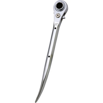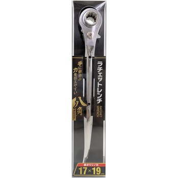 握りやすい八角グリップラチェットレンチ。17・19mmのボルト、ナットの取り回しに。八角形状グリップにより、手に馴染むことで握りやすく、効率的に力を伝えることができます。従来型に比べグリップ部に厚みをもたせることによりシノ部の強度が上がり、ハードな作業にも対応します。曲がりタイプのシノ形状です。ベーシックな2サイズのボルト・ナットに対応します。2か所のセーフティーコード取付穴付きです。