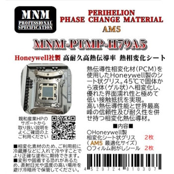 温度によって相変化(PCM)するシート状の熱伝導グリスとなります。 45℃前後から固体が液状化(ゲル化)し、優れた界面濡れ性と極めて低い接触抵抗を実現しました。 液体金属と違い液状化しても垂れにくく、特に高負荷(高TDP)CPU/GPU使用に最適です。 従来グリスでよくある「ポンプアウトによるホットスポット悪化」が起こりにくく高い信頼性を保ちます。 細かい傷に密着することでCPUやGPUから発せられた熱を効率よく伝達し、長寿命も相まって優れた放熱性能を長期間に渡り引き出し続けることが可能となります。