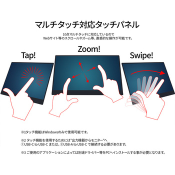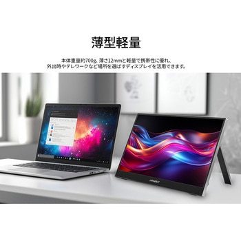 14インチのIPSパネルを搭載し、WUXGA(1920×1200)解像度に対応したモバイルディスプレイです。あらゆる角度から見ても色やコントラストの変化がおきにくいIPSパネルを搭載し、広視野角上下左右170°を実現します。10点マルチタッチに対応したタッチパネルを搭載しております。約700gの軽量設計と最薄部12mmの薄型本体は、優れた携帯性を備えています。HDR(ハイダイナミックレンジ)は、明るい部分も暗い部分もくっきり表現し、リアルに迫った深みのある映像を演出します。HDR対応コンテンツの表示が可能。モニター背面にキックスタンドを搭載しているので自立して使用することができ、どこでもデュアルディスプレイ環境の構築が可能です。また、携帯時に便利なソフトケースを同梱。入力端子としてハイブリッド対応(モニターへの電源と映像を1本で送信)のUSB-Cを2つとminiHDMIを1つ装備します。モニター画面のフリッカー(ちらつき)、およびブルーライト(青色光)を軽減し、目の負担を軽くします。75×75mmのVESAマウントに対応。1W×2のスピーカーを内蔵していますので、動画やゲームなどをお楽しみいただけます。本製品には、2年間のメーカー保証が付きます。