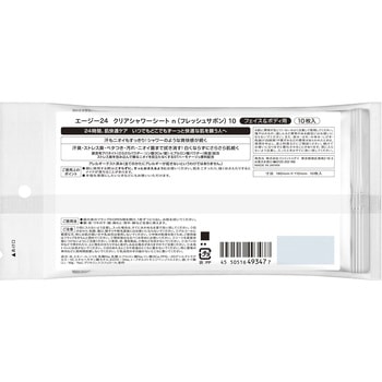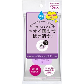 24時間、肌快適ケア。いつでもどこでもずーっと快適な肌を願う人へ。汗もニオイもすっきり!シャワーのような爽快感が続く。汗臭・ストレス臭・ベタつき・汚れ・ニオイ菌まで拭き消す!白くならずにさらさら肌続く。銀含有アパタイト(さらさらパウダー:リン酸3Ca/銀)・ヒアルロン酸パウダー(保湿)配合。清潔感ただようフレッシュサボンの香り