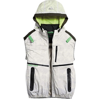 遮熱・UVカット機能に加え、撥水加工を施したストレッチの効いたサイドファン・ハーネス対応のベスト。脱着可能フードと風抜け抜群のワイドネックを採用。熱中症対策に配慮した3ヶ所の保冷剤ポケット。
