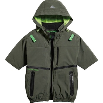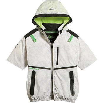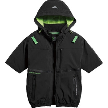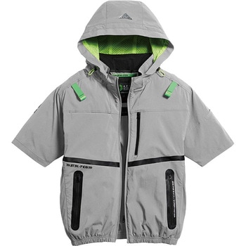 遮熱・UVカット機能に加え、撥水加工を施したストレッチの効いたサイドファン・ハーネス対応の半袖ジャケット。脱着可能フードと風抜け抜群のワイドネックを採用。熱中症対策に配慮した3ヶ所の保冷剤ポケット。