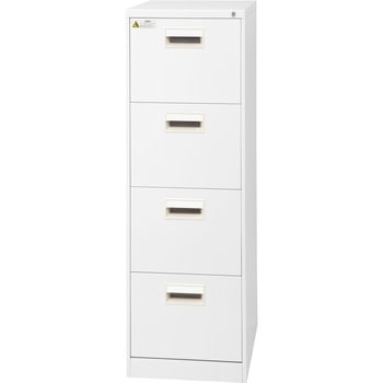 B4収納に適した4段タイプのファイリングキャビネットになります。1箇所のロックで全ての引出しが同時に施錠できるオールロック機構を採用しています。引き出しはラッチ付になります。樹脂仕切板が格段3枚付となっております。連結用ハーフパンチ加工を施しております(左右・背面)