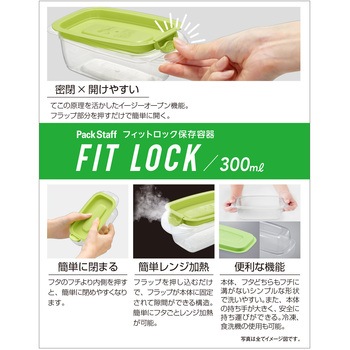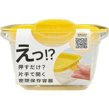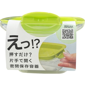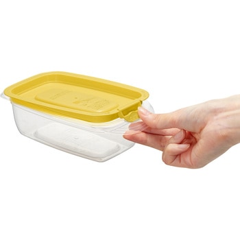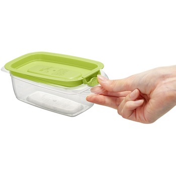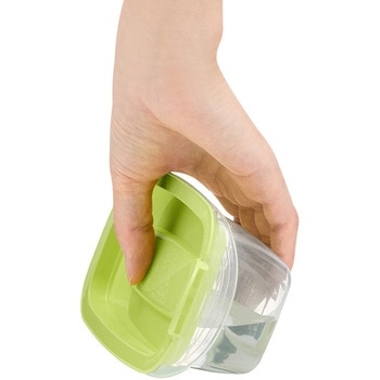 片手で開く保存容器。フラップを押すだけで簡単に開き、フタのフチの内側を押すと簡単に閉まる。フラップをSET位置に押し込むと隙間をキープできるので、蒸気が逃げ、フタごとレンジ加熱できる。また、持ち手が大きくしっかりと持てるので、加熱後でも安全に持ち運べる。さらにJIS基準水漏れ試験に適合した優れた密閉性。作り置きのおかずやスープなどの汁物もおいしく保存できる。冷凍保存もOK。容器本体は目盛り付きで、透明度の高いプラスチックを採用、中身がくっきり見えるので庫内で探しやすい。蒸気弁が無く、本体・フタ溝なし設計で洗いやすく、時短に。食洗機も対応。使わない時はコンパクトに重ねて省スペース収納ができる。