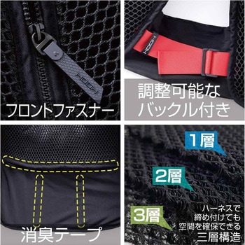 インナースペーサーの一部を3Dメッシュ三層構造にすることで、ハーネスで締め付けても内部に空間を確保できる快適設計!!
