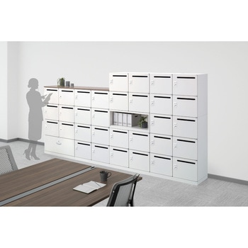 収納物のさまざまな用途に合わせた家具を、もっともバリエーションが豊かな、奥行きサイズ450mmに統一させ、オフィスをスッキリさせるタイプです。
