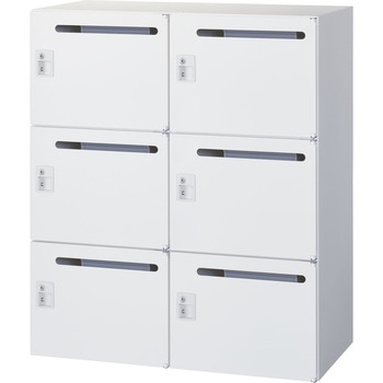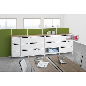 収納物のさまざまな用途に合わせた家具を、もっともバリエーションが豊かな、奥行きサイズ450mmに統一させ、オフィスをスッキリさせるタイプです。錠前はシリンダー錠。6人用のメールボックスなので多様な働き方に対応出来る配線機能を有した個人収納ボックスになります。オプションのノートPCスタンドを使用すればノートPCも省スペースで収納出来ます。下置き専用になります。(ベース別売り)