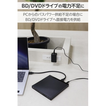 ポータブルDVD/BD製品の電力不足を補う別売オプション品 ― ACアダプター。バスパワー駆動では使用できないパソコンでも、電力を補助することでポータブルDVDやブルーレイドライブ製品を使用可能にするACアダプターです。本製品は、パソコンのバスパワーに依存せず、ロジテック製BD/DVDドライブへ直接電力を供給します。ドライブに対応するディスクを挿入してもパソコン側で読み込めない場合などにご使用ください。