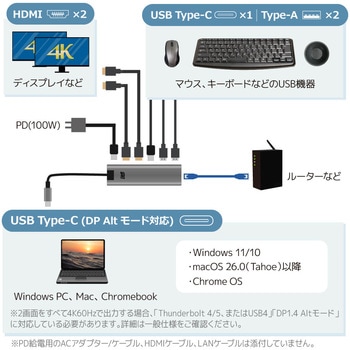 デュアルディスプレイアダプター(最大4K60Hz、PD・LAN・USBハブ搭載)