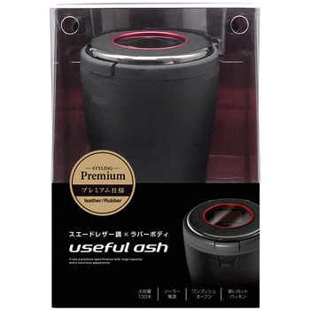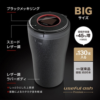 最高クラスの性能を持ったスエードレザー調&ラバーボディの灰皿です。タンブラー形状だから開口部が広く灰が捨てやすいです。ワンプッシュオープンタイプです。電池交換不要のソーラー電源です。挿し込むだけで消火できる1アクション火消し口を2個装備しています。(ツマリ防止機能付き)パッキンを使用し、フタを閉じた際のタバコの煙やにおい漏れを軽減します。フタを開けると周りの暗さに反応し、自動でブルーLEDが点灯します。(明暗判別機能)約130本入る大容量灰皿です。