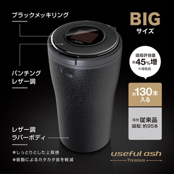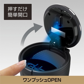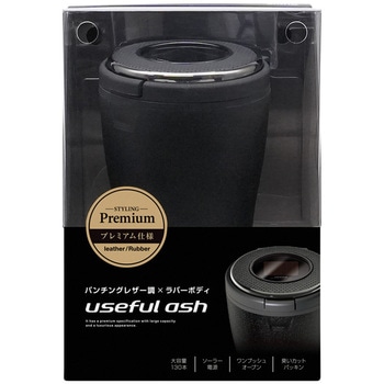 最高クラスの性能を持ったパンチングレザー調&ラバーボディの灰皿です。タンブラー形状だから開口部が広く灰が捨てやすいです。ワンプッシュオープンタイプです。電池交換不要のソーラー電源です。挿し込むだけで消火できる1アクション火消し口を2個装備しています。(ツマリ防止機能付き)パッキンを使用し、フタを閉じた際のタバコの煙やにおい漏れを軽減します。フタを開けると周りの暗さに反応し、自動でブルーLEDが点灯します。(明暗判別機能)約130本入る大容量灰皿です。