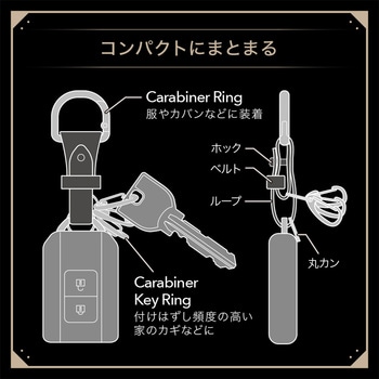 スマートキーが主役になるコンパクトで使いやすい上質レザー調のキーリングです。メインのスマートキーをベルトに通し使用します。その他のカギも取付可能な脱着しやすいミニカラビナ(3つ)付きです。服やカバンに取り付けられるDカン付きです。