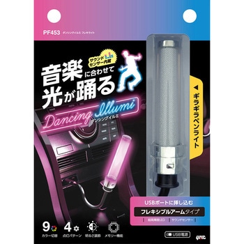 音に合わせて光が踊る、フレキシブルアームタイプのランプです。LEDの発光色を9色+グラデーションモード(9色がゆっくりと順番に自動で切り替わる)から選択することができます。4種類の点灯パターンから選択可能です。明るさ調節機能付きです。色と明るさを記憶するメモリー機能を搭載しています。
