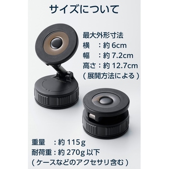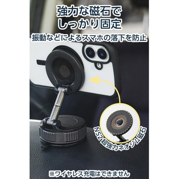 ドライブをもっと快適に。車のダッシュボードに簡単に取り付けられるスマホホルダーです。N52超強力ネオジム磁石でスマートフォンをしっかり固定し、運転中の振動や急ブレーキでも落下を防止。ダイヤルを回して真空状態にすることで浅めのシボ面にも強力に吸着できるゲル吸盤タイプです。使わないときは邪魔にならないよう、折りたたんでコンパクトに収納できます。