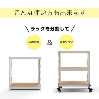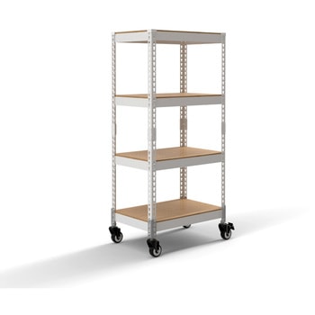 中型キャスター付きのシェルフ4段。ネジ締め不要で組み立て簡単。差し込んで、付属のハンマーではめ込むシンプルな組み立て。