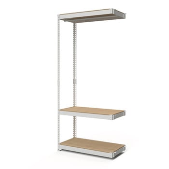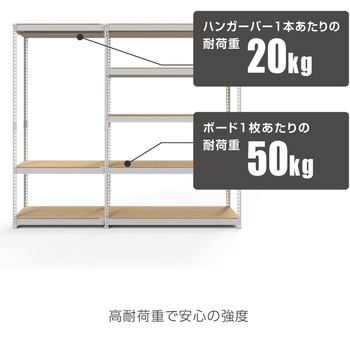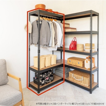 シリーズの本体(高さ180cmのシェルフ5段かハンガーラック3段)に連結できる、連結用ハンガーラック3段。L字型(コーナー連結)にもI字型(横並び連結)にも連結可能。コーナー連結時は中央の支柱がなく、モノの出し入れがしやすい。耐荷重はボード1枚あたり50kg、ハンガーバー1本20kg。合計170kg高耐荷重で大容量収納可能。ボードはナチュラルとブラウンのリバーシブル仕様。棚の高さは3cm間隔で調節可能。