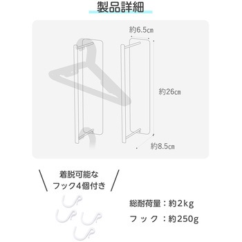 付属品フック×4セット内容本体×2材質スチール(粉体塗装)、マグネット、シリコン、ナイロン質量(kg)0.5ホワイトサイズ幅約65mm×奥行約85mm×高さ約260mm(1個あたり)耐荷重約2kg(1個あたり)、フック内容量1個