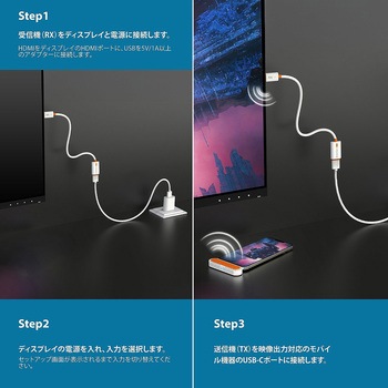 JVAW60 は、USB-C 端子を搭載したスマートフォン、タブレット、ノートPCの画面を、ワイヤレスで HDMI 対応ディスプレイへ簡単にミラーリングできる送受信機セットです。