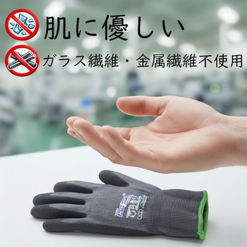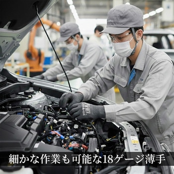 柔軟性と耐切創性を兼ね備えた耐切創ニトリル背抜き手袋です。18ゲージの極薄仕様で、手にぴったりフィットします。金属・ガラス繊維を使用しておらず、肌への刺激を抑制します。マイクロフィニッシュ特殊すべり止め加工により、油の付着した部品もしっかりグリップします。手のひらWコーティングにより、発泡タイプのような油の染み込みがなく、快適な作業環境を実現します。菌の繁殖を抑制し、汗などによるニオイを防ぐサニタイズ抗菌抑臭加工を施しています。