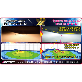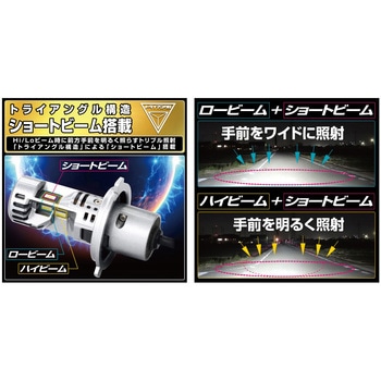 ムラの無い均一な光・フィラメント型LEDの特殊配列・トリプル照射「トライアングル構造」採用。追加ショートビームで、ハイビーム / ロービーム時に手前が明るい!