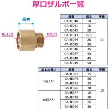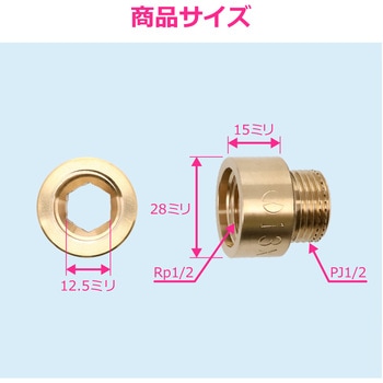 水栓と配管の間に使用して、仕上げ面までの距離を調整します。切削品に比べて応力腐食割れに強い黄銅鍛造製です。ネジ部にローレットと呼ばれる加工がされており、シールテープが巻きやすくなっています。取付けには対辺12ミリの六角レンチが必要です。地域によって「ザルボ」「持出しソケット」「継足しソケット」などとも呼ばれています。一部地域では長さ15ミリを「1倍」、22.5ミリを「1.5倍」、30ミリを「2倍」と呼称します。工事業者様(法人)に便利な複数まとめ売りも展開しています。