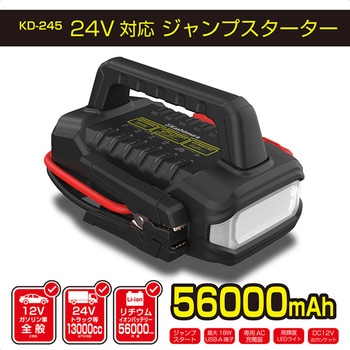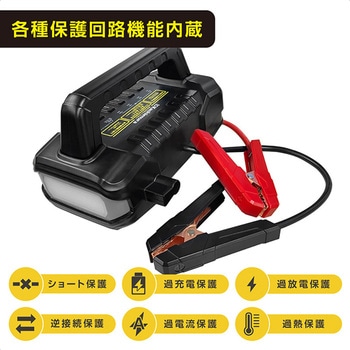 セット内容本体,専用AC充電器,付属品収納用袋寸法(mm)262×148×188質量(kg)2.7出力【DCソケット】DC12V/10A(120W)、【USB-A出力端子】DC5V/3A(15W),DC9V/2A(18W),DC12V/1.5A(18W)、【ジャンプスタートDC12V時】480A(起動電流)・900A(ピーク電流)、【ジャンプスタートDC24V時】600A(起動電流)・1500A(ピーク電流)入力DC29V/2A(58W)※専用AC充電器バッテリー【リチウムイオンバッテリー】3.7V・56000mAh充電時間約4時間(専用AC充電器使用)対象【ジャンプスタート対象車】ガソリン車(12V)全般,ディーゼル車(12V)全般,ディーゼル車(24V)13000cc以下充電可能回数1000ケーブル長(cm)【ジャンプスタートケーブル(~クリップ端まで)】プラス端子クリップ側:約35 / マイナス端子クリップ側:約35内容量1台