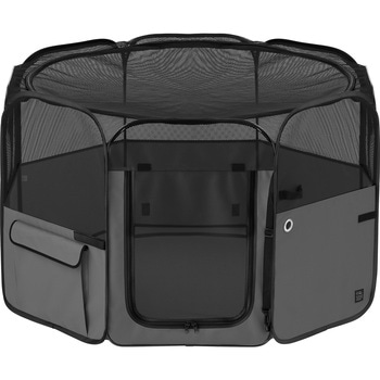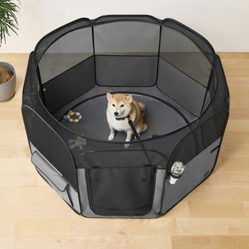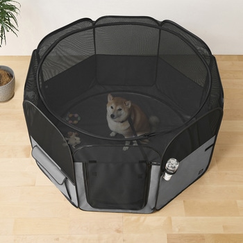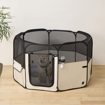 折りたたんで持ち運べる、折りたたみファブリックサークルです。組み立て・折りたたみが簡単で、必要な時に広げて使えるソフトタイプです。天面メッシュ・底面マットが取り外し可能です。天面はメッシュ生地になっているので、ペットの様子が見えて安心です。飛び出し防止のリード付き、リードは持ち手としても使用可能です。天面メッシュと底面マットを収納できるポケット付きです。給水ボトル取り付け用のゴムには滑り止めがついており、飲み口の高さは各適応犬種の体高に合わせています。外出や屋外用に、室内スペース用に、災害時にとあらゆるシーンで使用できます。