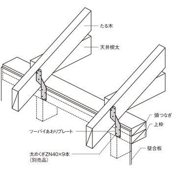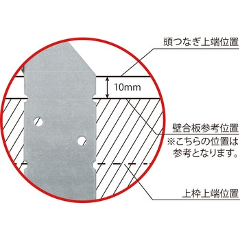 たる木またはトラスと頭つなぎ、上枠の接合に使用する金物です。たる木が204材の場合でも金物がはみ出さず、確実に施工できます。壁合板は厚さ12mmまで対応いただけます。壁合板を頭つなぎ上端位置より下に10mmの位置で止め付けた場合、金物の凹部(上側)が施工ガイドとなります。また、金物の凹部(下側)は、壁合板より先に金物を止め付けた場合の施工ガイドとなります。 ※取付施工例参照金物上部の丸み形状により、どのような勾配にも金物がたる木よりはみ出すことなく施工できます。