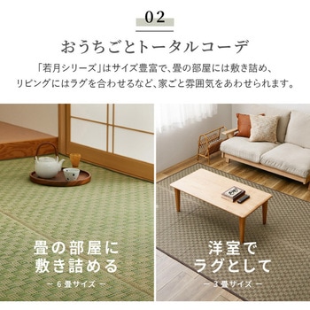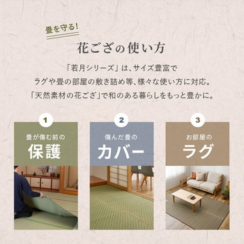 「若月シリーズ」は、お部屋のラグとしてや、畳を保護する上敷きとしてなどの豊富なサイズバリエーションに、用途にあわせて裏地の有無もお選びいただけます。こちらは薄手で扱いやすく、畳本来のクッション性を活かせるため和室におすすめな裏地なしタイプです。