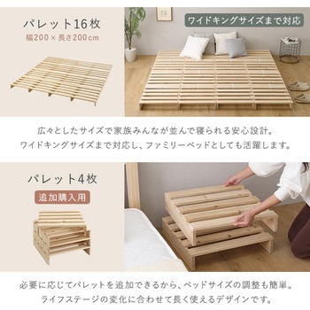 組み合わせ自由なパレットベッド 16枚入り!工具不要で金具をはめるだけで簡単に設置が出来ます。パレット1枚も軽量ですので、簡単に移動させることも可能です。杉を使用しているので、木の香りを感じられてリラックスして眠りにつくことが出来ます。※8枚入り×2のセット商品です。