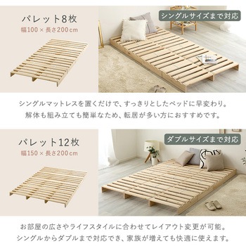 組み合わせ自由なパレットベッド 12枚入り!工具不要で金具をはめるだけで簡単に設置が出来ます。パレット1枚も軽量ですので、簡単に移動させることも可能です。杉を使用しているので、木の香りを感じられてリラックスして眠りにつくことが出来ます。※8枚入りと4枚入りのセット商品です。