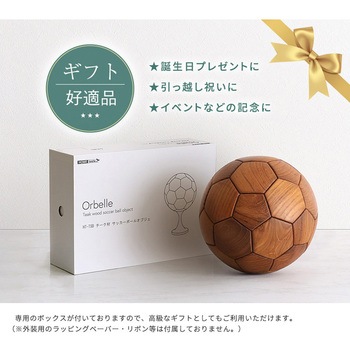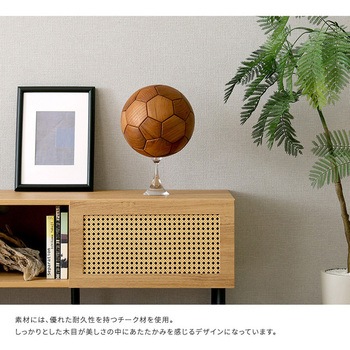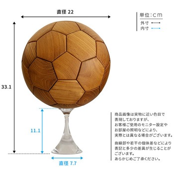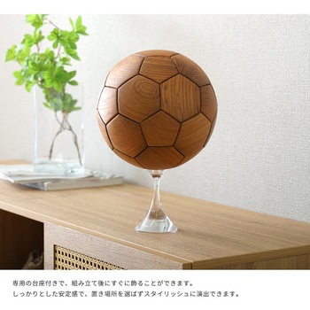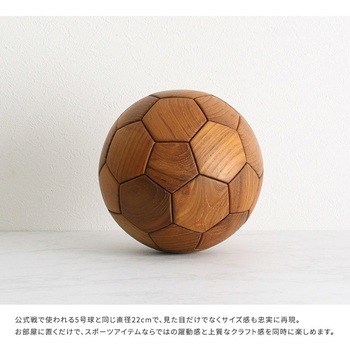 チーク材を使用したサッカーボールのオブジェです。チーク材を使用しているので、木のぬくもりを感じられ、高級感も演出してくれます。直径22cmと本物の5号球と同じサイズ感です。専用の台座付きで、おしゃれに飾っていただけます。