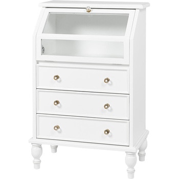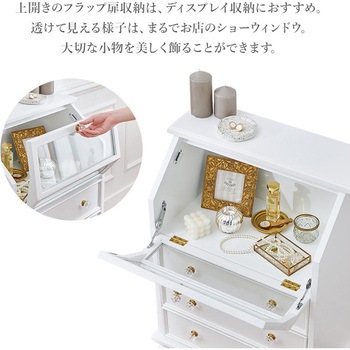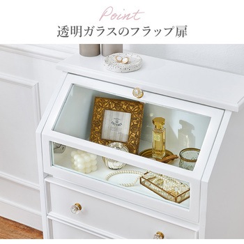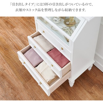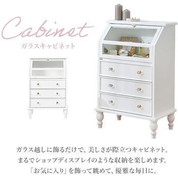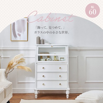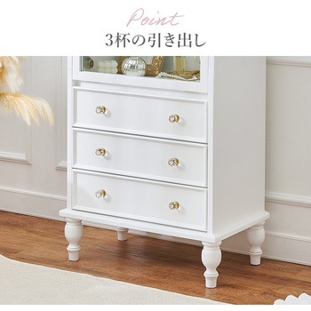 2つの収納タイプから選べるエレガントなガラスキャビネット。お部屋を特別感のある上品なインテリア空間に変えてくれる魔法のキャビネットです。クリスタル調の取っ手やろくろ脚、細部に施されたアンティーク調加工がこだわりのクラシカルデザイン。姫系インテリアやホワイトインテリアにぴったりです。自宅用にはもちろん、店舗用のディスプレイ棚として使ったり、ネイルサロンや美容院に置いても映えるキャビネットです。また、グッズやぬい、DVDやCDの収納など、推し活棚としても活躍します。高さ調節ができる可動棚つきの「ガラス扉タイプ」、3杯の引き出しつきの「引き出しタイプ」の2タイプからお選びいただけます。