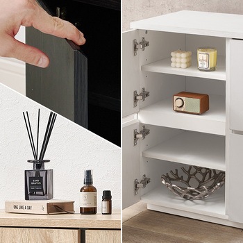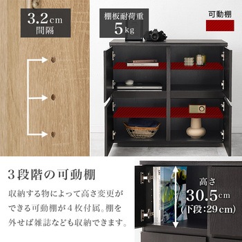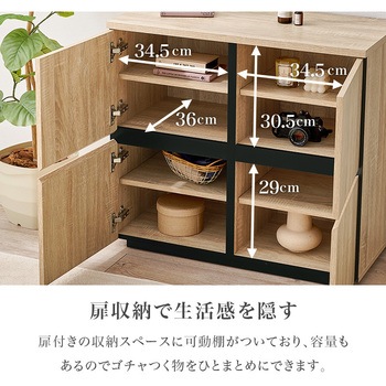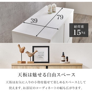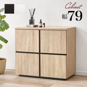 用途にあわせて幅広く使えるキャビネット「ナイス」衣類や本・雑誌、文房具や貴重品などさまざまなものの収納棚として使えます。扉収納は可動棚で高さの調節が可能。背の高いものを収納したい場合は、可動棚を外して収納することもできます。背面には安全面に配慮した揺れ防止具付きです。カラーバリエーションは3色展開。ブラックのアクセントで引き締まって見えるナチュラル、清潔感のあるホワイト、どんなお部屋にも合わせやすいダークブラウンから選べます。【商品サイズ(約)】幅79×奥行39×高さ71cm【梱包サイズ(約)】88×44.5×23cm(33.5kg)【材質】プリント紙化粧パーティクルボード【生産国】マレーシア【備考】組立品(プラスドライバー・ハンマーが必要)