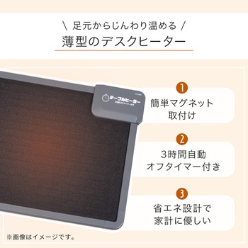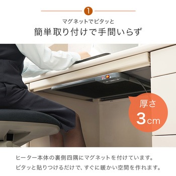秋冬の冷え込む時期におすすめのアイテム「デスクヒーター」薄型なので邪魔にならず、オフィスにも取り入れやすいシンプル設計。冷えやすい足元をじんわりと温めてくれます。マグネットで簡単に取り付けが可能。磁石対応不可のデスクは、付属の両面テープorネジで固定することができます。また3時間経過すると自動で電源が切れる、「電源自動OFFタイマー」が内蔵されているので、万が一、切り忘れてしまっても安心。電気代は1時間あたり2円程度(目安)と、省エネ設計なところも嬉しいポイント。温風が出ないので空気を乾燥させず、体にも優しいデスクです。家族や友達、職場の同僚と一緒に買ってみるのもおすすめです。【商品サイズ(約)】幅43×奥行36×厚み3cm【材質】ABS樹脂【生産国】中国【備考】完成品