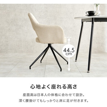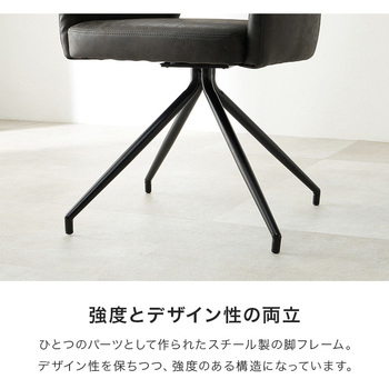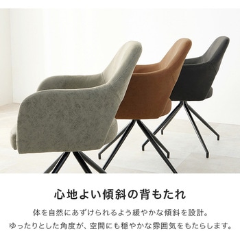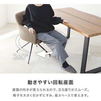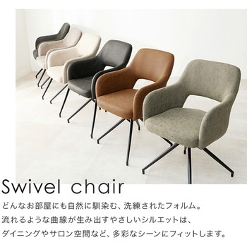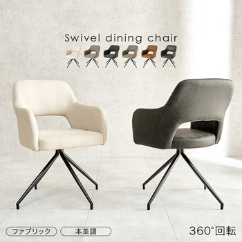 本革をリアルに再現したヴィンテージ風の合成皮革とサラッとした肌触りのファブリックの2種類の生地から選べるダイニングチェア。実は座面が360度回転するので、椅子の出し入れもしやすく、機能面にも優れたデザインチェアーです。体を自然と預けられるような緩やかな背もたれと、分厚いクッションが長時間身体を支え、ダイニングチェアとしてはもちろん、在宅ワークで使用するデスクチェアとしても活躍。生地は、ヴィンテージ感溢れる合成皮革を使用したタイプと、シンプルなファブリックタイプをご用意しました。オシャレなデザインなので置くだけで素敵な空間に。ヴィンテージ・カフェ風・モダン…どんなスタイルにも合わせられるアイテムです。【商品サイズ(約)】幅53×奥行54×高さ78cm【梱包サイズ(約)】55×53×45cm(8kg)【材質】脚部:鋼鉄(粉体塗装)座部:積層材生地(PU):合成皮革生地(ファブリック):ポリエステルクッション材:ウレタンフォーム【生産国】中国【備考】組立品(工具付属)