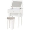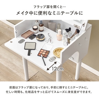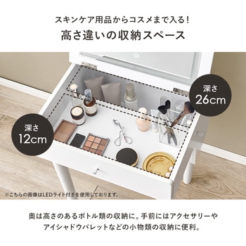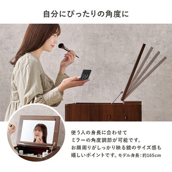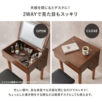 ドレッサーとしても、デスクとしても使える2WAYドレッサーデスク。ワンルームや狭いお部屋にも起きやすいコンパクトなデザインです。おしゃれなスツールも付いてくるドレッサーセットは新生活にもオススメ。天板の下には収納空間があるので、コスメ収納やジュエリー収納スペースとして活躍します。さらにコンセント付きなので、ドライヤー・コテ・アイロン・スチーマーなどの美容家電の使用や、スマートフォンの充電にも使えます。【商品サイズ(約)】ドレッサー:幅52×奥行44.5×高さ68cmスツール(ダークブラウン):幅33×奥行27×高さ39.5cmスツール(ホワイト):幅30×奥行30×高さ39.5cm【梱包サイズ(約)】57×51×38cm(16.6kg)【材質】脚部:天然木座部:繊維板表面塗装:ラッカー塗装張り材:(ダークブラウン)合成皮革、(ホワイト)ポリエステルクッション:ウレタンフォーム【生産国】中国【備考】・脚とフックのみ取り付け・プラスドライバーをご用意ください