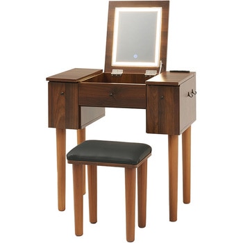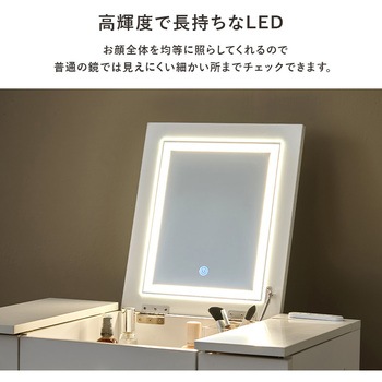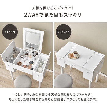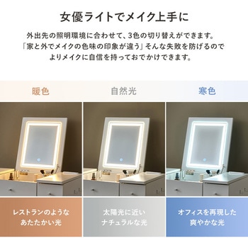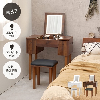 ドレッサーとしても、デスクとしても使える2WAYドレッサーデスク。天板の下には収納空間があり、引出しも付いているので、コスメ収納やジュエリー収納スペースとして活躍します。LEDライトは、暖色、自然光、寒色の3種類の光と明るさを調整できるので、シーンに合わせてメイクが可能です。さらにコンセント付きなので、ドライヤー・コテ・アイロン・スチーマーなどの美容家電の使用や、スマートフォンの充電にも使えます。【商品サイズ(約)】ドレッサー:幅69×奥行40×高さ68.5cmスツール(ダークブラウン):幅33×奥行27×高さ39.5cmスツール(ホワイト):幅30×奥行30×高さ39.5cm【梱包サイズ(約)】72×44×33cm(22.7kg)【材質】脚部:天然木座部:繊維板表面塗装:ラッカー塗装張り材:(ダークブラウン)合成皮革、(ホワイト)ポリエステルクッション:ウレタンフォーム【生産国】中国【備考】・脚とフックのみ取り付け・プラスドライバーをご用意ください