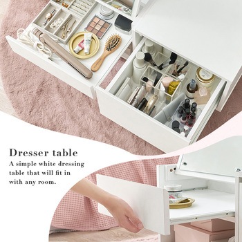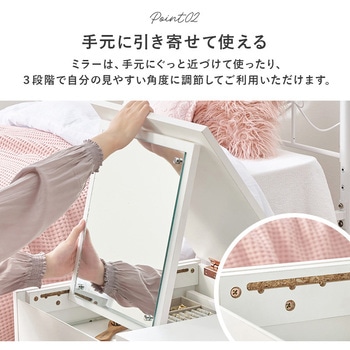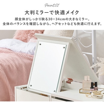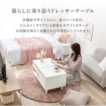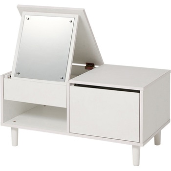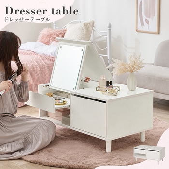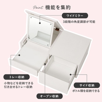 テーブルとドレッサー、2つを1台にまとめた省スペース設計のドレッサーテーブル。大きなミラー付きで、食事や作業をするときはテーブル、お出かけ前はミラーを立ててドレッサーとして使える便利な2WAY仕様。トレー収納・サイド収納・オープン収納の3タイプの収納スペースにコスメやメイク道具、アクセサリー、美容家電、ネイル…などまとめて収納できます。テーブルとドレッサーを別々に置かなくてもいいので、ワンルームや一人暮らしのお部屋におしゃれで快適な暮らしを叶えます。【商品サイズ(約)】幅80×奥行45×高さ40cm【梱包サイズ(約)】86×51×22cm(27kg)【材質】合成樹脂化粧パーティクルボード(メラミン樹脂)【生産国】ベトナム【備考】組立品(プラスドライバー・ハンマーをご用意ください)