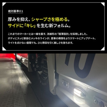 これまでのマーカーとは一線を画す、流線形の「極薄設計」を採用しました。ボディにスッと馴染むメッキのラインが、愛車の横顔をよりスマートにアップデート。ライトを点けない昼間でも、ひと際目を引く美しさを放ちます。