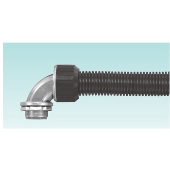 サンフレキROBOを制御盤類のノックアウトに接続するための本体が亜鉛合金ダイカスト製の90°形コネクタです。袋ナットは、N2型と同じ樹脂製で色調は黒色です。サンフレキROBOとコネクタの引張力は250N(JIS C8461-23の分類コードは2ライト)です。