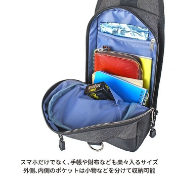 スマホだけでなく、手帳やパスポートなど楽々入るサイズです。ポケットがあり、小物などを分けて収納可能。ストラップは左右付け替えが可能なので、どちらの肩に掛けても体にフィットします。背面はクッション性のあるメッシュ素材なので、長時間背負っても疲れにくく通気性が良いため蒸れにくい工夫をしております。タウンユースから、通学に遠足、スポーツや旅行など様々なシーンでお使いいただけるバッグです。