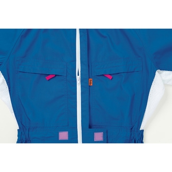 フロント:コイルファスナー、袖口:面ファスナー、ウエスト:脇ゴム、左袖ペン差し