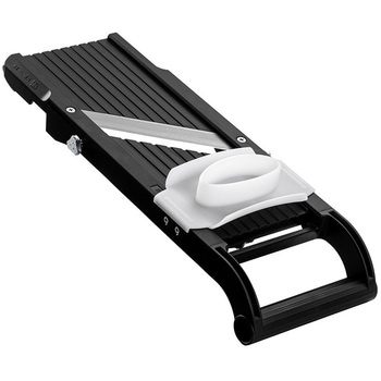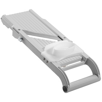 野菜スライサー一筋70年のベンリナーが、スライスを極めた逸品。厚さ調節は、自由に厚さを調節できる、無段階の平行昇降機構の採用により、更に精緻で安定したスライス性能を実現。ハンドル部分は、従来のスーパーベンリナーより柄の部分を長くし、湾曲部分の落ち込み角度を深くすることによって、ゆとりのある空間を確保、スライス時の両手の交差がスムーズにできます。ブレードケース付きで、付属の交換刃を収納可能。ひっかけ足、滑り止め、料理に役立つ機能満載。