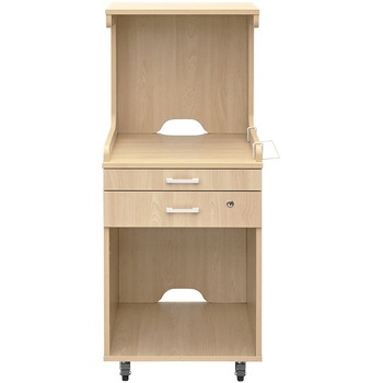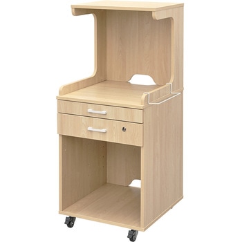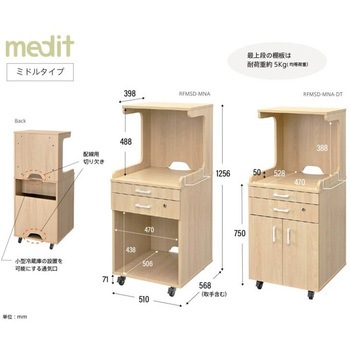 ハイ・ミドル・ローの3種の高さバリエーションと、扉・可動棚板の有無が選べるメディット(medit)シリーズの床頭台。ミドルタイプには、最上段の棚板、スライド天板、鍵付き引出しと左右お好みの側に取り付けられるタオルハンガー1個を標準装備。中段には配線切り欠きがあり、ポットや小型テレビ、モニター(20インチまで)を設置可能。また、通気口が確保された下部の収納スペースには小型冷蔵庫を設置できます。4輪自在キャスター付きで、手前2つにはストッパーがあります。 医療・介護系施設の床頭台として、また、社員寮や学生寮等のベッドサイドキャビネットとしてもご利用いただけます。