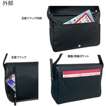 正面フラップ:ファスナーポケット、片側面:オープンポケット、背面:オープンポケット、正面フラップ内側:オープンポケット、本体内部:ファスナーポケット、オープンポケット×2、ペン差し 、底板