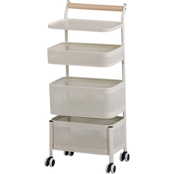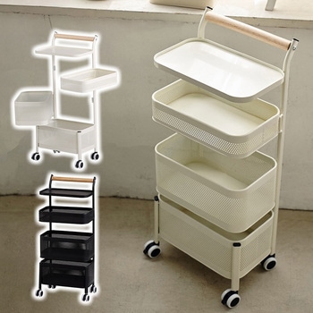 木製ハンドルが北欧風でかわいいトローリーラック。キャスター付きで必要な場所まで簡単に移動可能です。2段目と3段目のバスケットはスイングし、必要なアイテムを取り出しやすいデザイン。おもちゃや文房具の整理整頓や、脱衣所において着替えやタオルストックを入れておいたり、メッシュバスケットなのでキッチンでの野菜保存にもおすすめです。