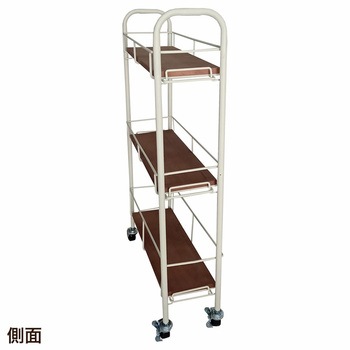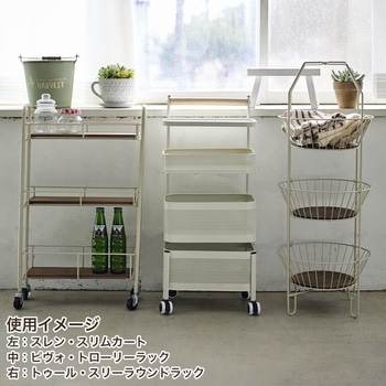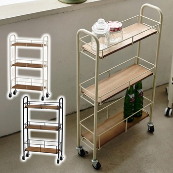 温かみのある木製天板が、実用性とデザイン性を兼ね備えたスリムカートです。幅を取らない設計ながら、3段の収納スペースで日用品や小物をたっぷり収納。キャスター付きで移動もラクラクで、狭いスペースにもすっきり収まります。カフェ風や北欧スタイルのインテリアにもぴったりのデザインです。