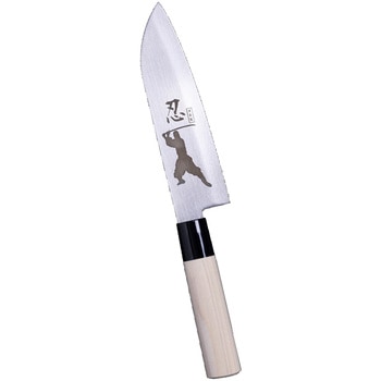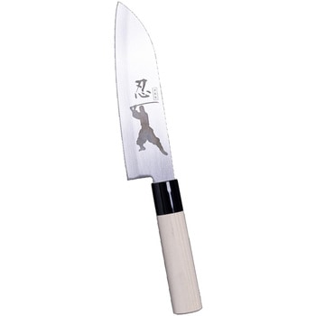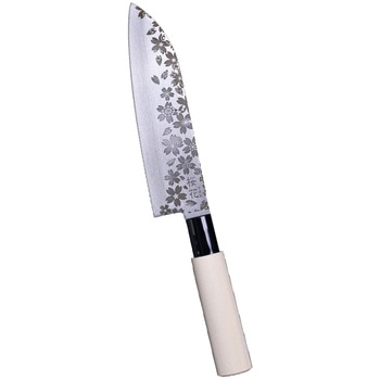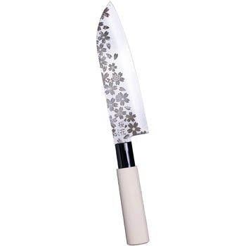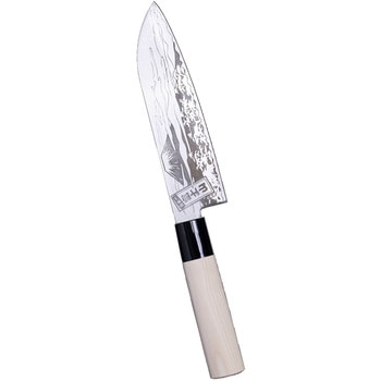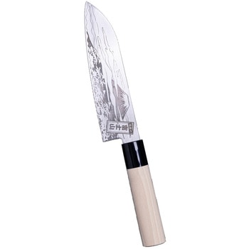 デザインの入った雨天レス三徳包丁。食洗器不可。研ぎ直し可能。