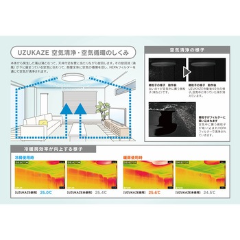 羽のないシーリングファンライト’UZUKAZE’。お部屋の空気のよどみを解消するサーキュレーター機能とクリーンな空気を循環させる空気清浄機能をお部屋の中心から発生させることで省エネ効果を大きく発揮します。本体3か所に設置されたHEPAフィルターがお部屋に漂う塵やホコリを除去。フィルターは取り外しできるのでお手入れも簡単です。